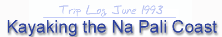 Lihue, Kauai, Saturday, June 5, 1993. Up at five. Today I am to meet my guide from Kayak Kauai, Mike, at Kapa'a, at 6 a.m., to drive up the north coast to Hanalei Bay and embark on a trip by sea kayak along the Na Pali Coast. I am filled with anticipation, but also with a touch of apprehension. A catchy, nagging, Latin tune from the 1940's races unbidden through my head, over and over: "No can do, no can do; My mama and my papa both say no can do." This could have been a charming memory from a bygone era which celebrated restraint; you certainly don't hear any such counsel in today's pop hits. But it is hardly what I want for my first ocean kayak expedition. I had been thinking for years of making such a trip but supposed that some necessary pieces were missing. I could handle a kayak on calm water; I could handle a rubber raft or a canoe on a whitewater river. But I have never handled a kayak in rough water, and the ocean would be completely new territory for me. However, the outfitter, Kayak Kauai, informs me that it's doable with a guide. All you need, they say, is to be in moderately good shape, not get seasick, and have suitable weather. From Monday, when I signed on for the trip, to Friday, the weather has been a question mark, but the next-to-final decision, Friday afternoon, is that the weather would be OK, without too much wind or surf. The wind is up all day Friday, but the forecast for Saturday is relative calm.